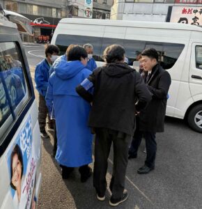 街頭演説会などの集会にて設営や受付、政策ビラ配布等をお手伝いしていただく活動です。